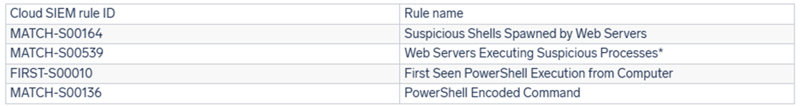 Cloud SIEMのルールには、ターゲットとなるSharePointサーバー上での疑わしい実行に焦点を当てたものがあり、SharePointを中心とした幅広いアクティビティ (中にはより一般的なものも含まれます) を監視します。