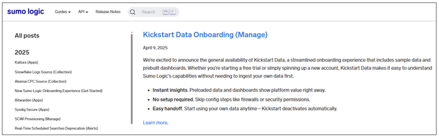 以下のリリースノートに記載のある通り、Sumo LogicのKickstart Data一般提供が開始されました。