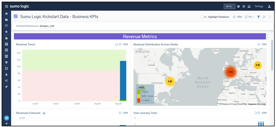こちらのダッシュボードは、記のSumo Logic Kickstart Data - Application Healthからさらにドリルダウンしたような世界の地域別収益、プロモーションの影響度合い、ユーザーの目的を達成するまでにかかる時間と収益の傾向を表示し、どのように影響があるかを確認可能です。