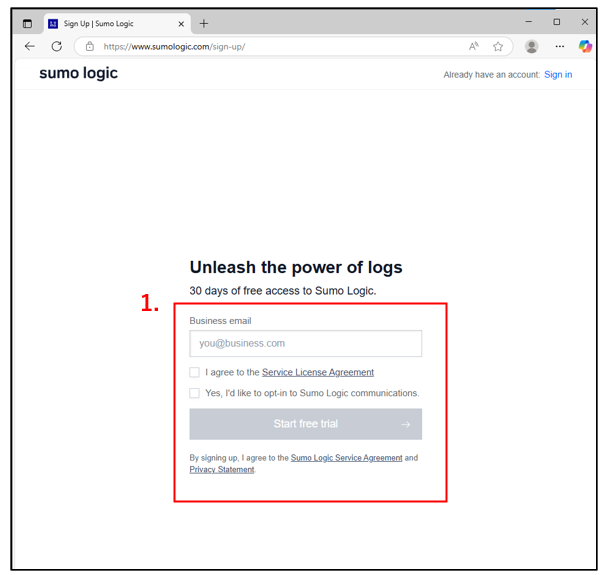 - 以下のURLからEmailアドレスを入力し、2つのチェックボックスの内容を確認後、「Start free trial」をクリック