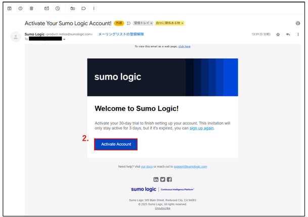 - 「Please check your inbox」というメッセージの画面が出た後、以下受信メール内の「Activate Account」をクリック