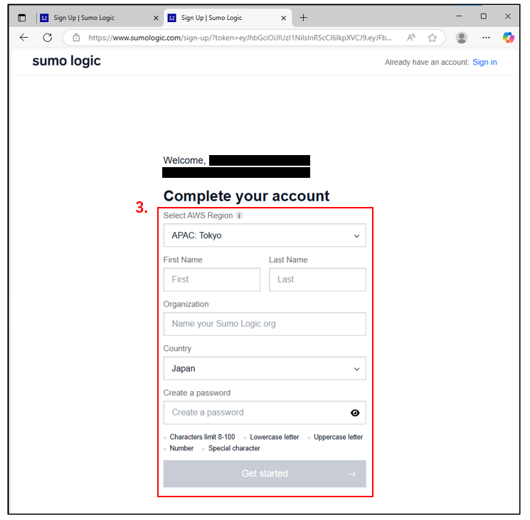 - 以下の必要事項を英語で入力後、「Get started」をクリック