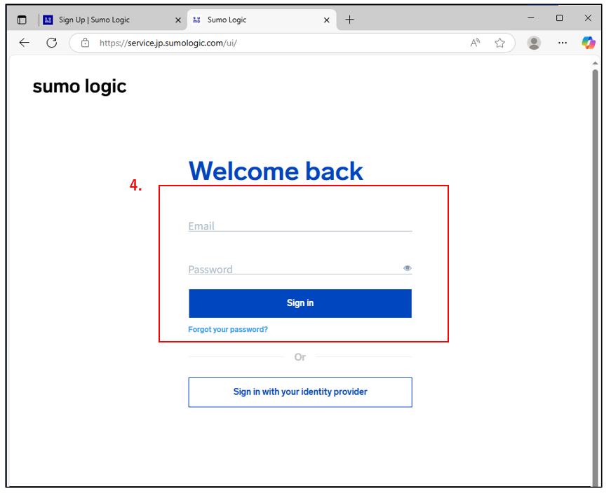 Emailは1.で入力したもの、Passwordは2.で入力したものをログイン画面にて入力